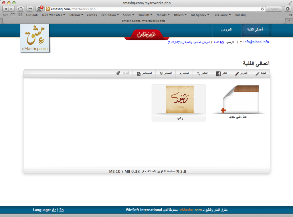 عندما تدخل اسمك وكلمة السر سيأخذك البرنامج إلى أعمالي الفنية: هنا تستطيع استعراض أعمالك السابقة وفتحها لاجراء تعديلات عليها أو انشاء عمل جديد بالضغط على عمل فني جديد1.