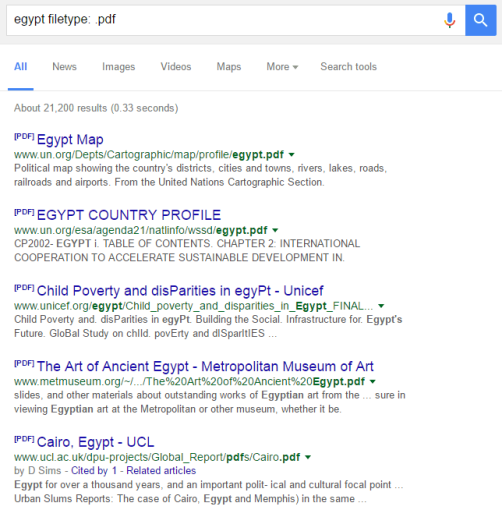 إن كنت بحاجة للوصول لملف معيّن بصيغة معينة مثل ملف PDF أو ملف Word فمحرك البحث يوفّر لك هذه الإمكانية من خلال إمكانية البحث عن صيغة ملف معيّنة وبالتالي كل نتائج البحث ستكون ملفات من الصيغة التي بحثت عنها في البداية ولكن لتحصل على هذه الملفّات يجب عليك البحث استخدام التركيب التالي :Filetype فإن كنت ترغب البحث عن كتاب معيّن أو ملف PDF كل ما عليك القيام به هو وضع التركيب التالي في خانة البحث الخاصّة بجوجل Filetype:PDF "عنوان الكتاب أو الملف" وحينها ستحصل على نتيجة البحث المطلوبة.